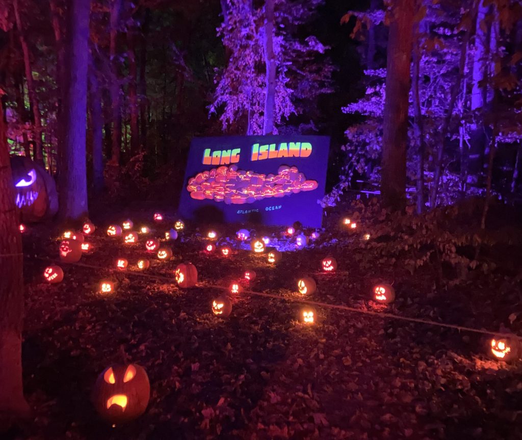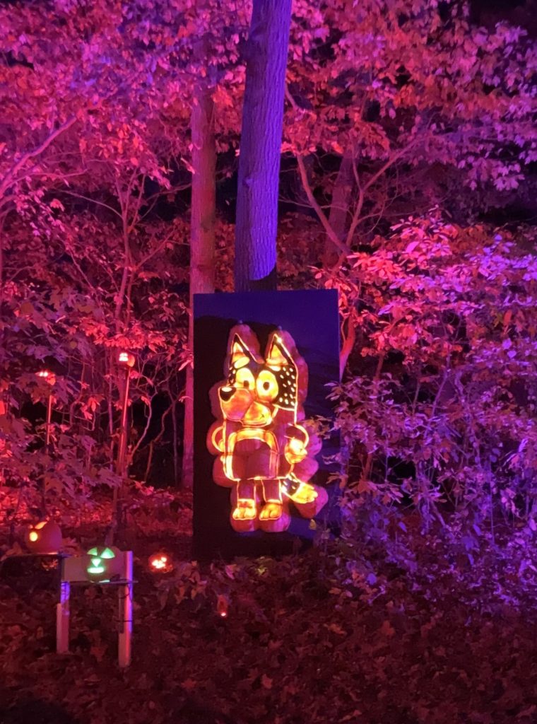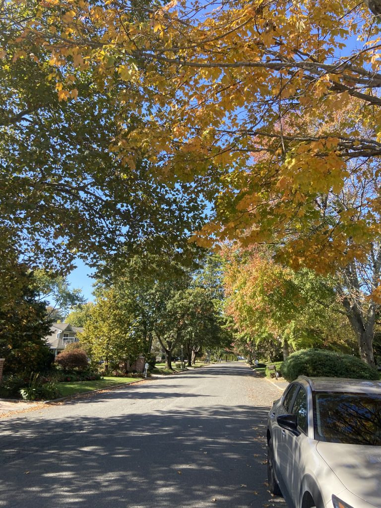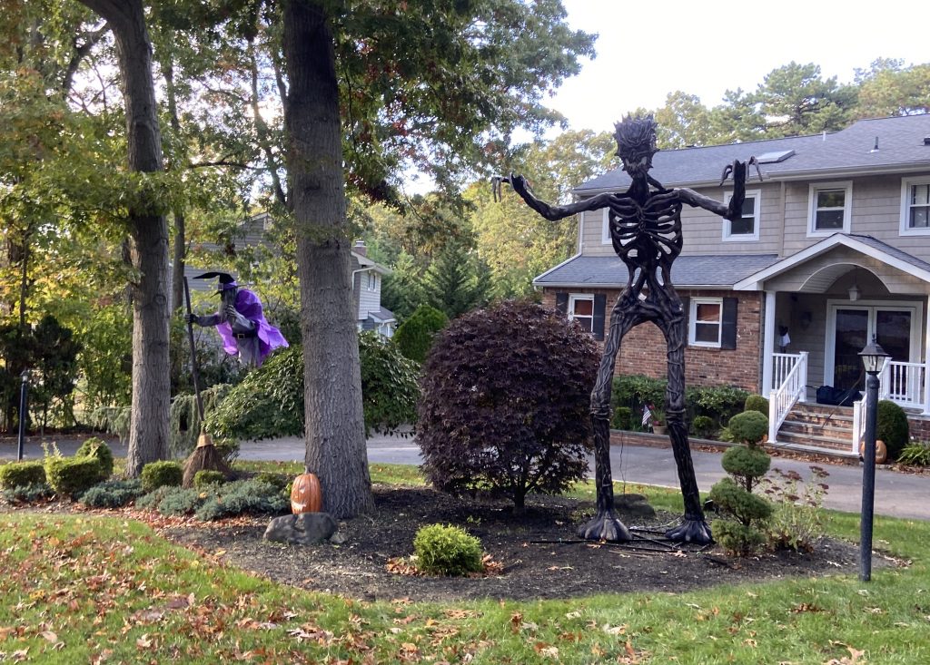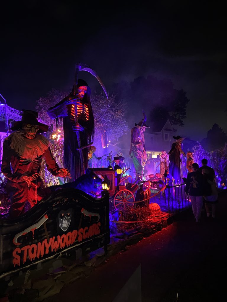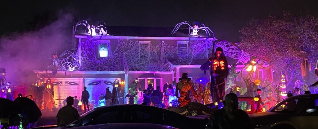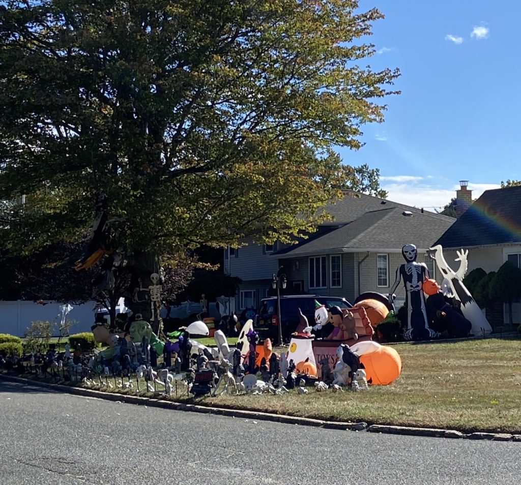 Außerdem war ich im Oktober ein paarmal spazieren. Das Wetter war ja immer noch sehr warm (um die 20°C) und sonnig, perfekt für Spaziergänge 🙂 Eigentlich würde ich auch gerne viel öfter spazieren gehen, aber leider kann ich mich dazu selten aufraffen… Jedenfalls hat man im Laufe des Monats immer mehr Halloween Dekorationen überall gesehen. Das war schon sehr typisch amerikanisch, aber ich fand’s cool. Bei strahlendem Sonnenschein sieht’s auf den Fotos allerdings nicht so gruselig aus haha Ich war dafür aber mit meiner Gastfamilie am 30. Oktober bei ein paar Häusern, die besonders aufwändig dekoriert waren. Vor allem ein Haus war sehr krass, das war mit Nebel, sich bewegenden Figuren, Geräuschen/Musik, Bildschirmen in den Fenstern und so weiter dekoriert.