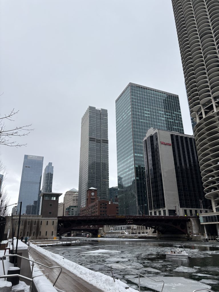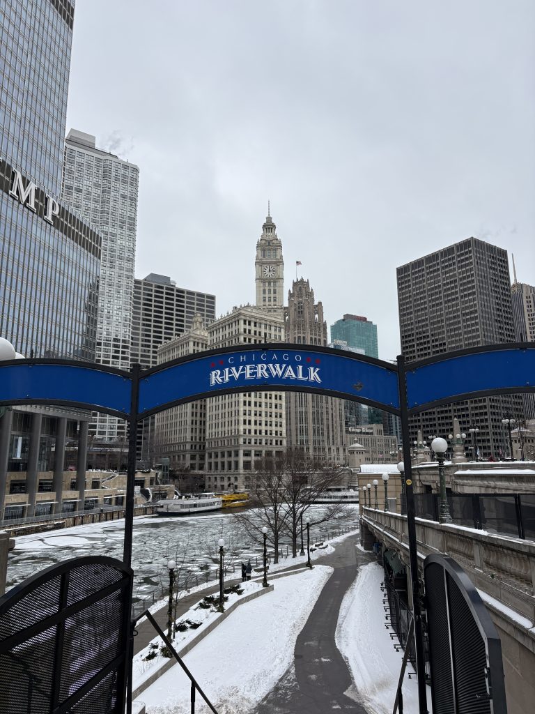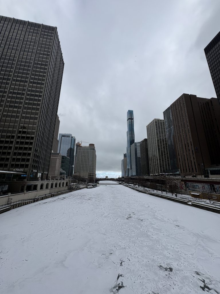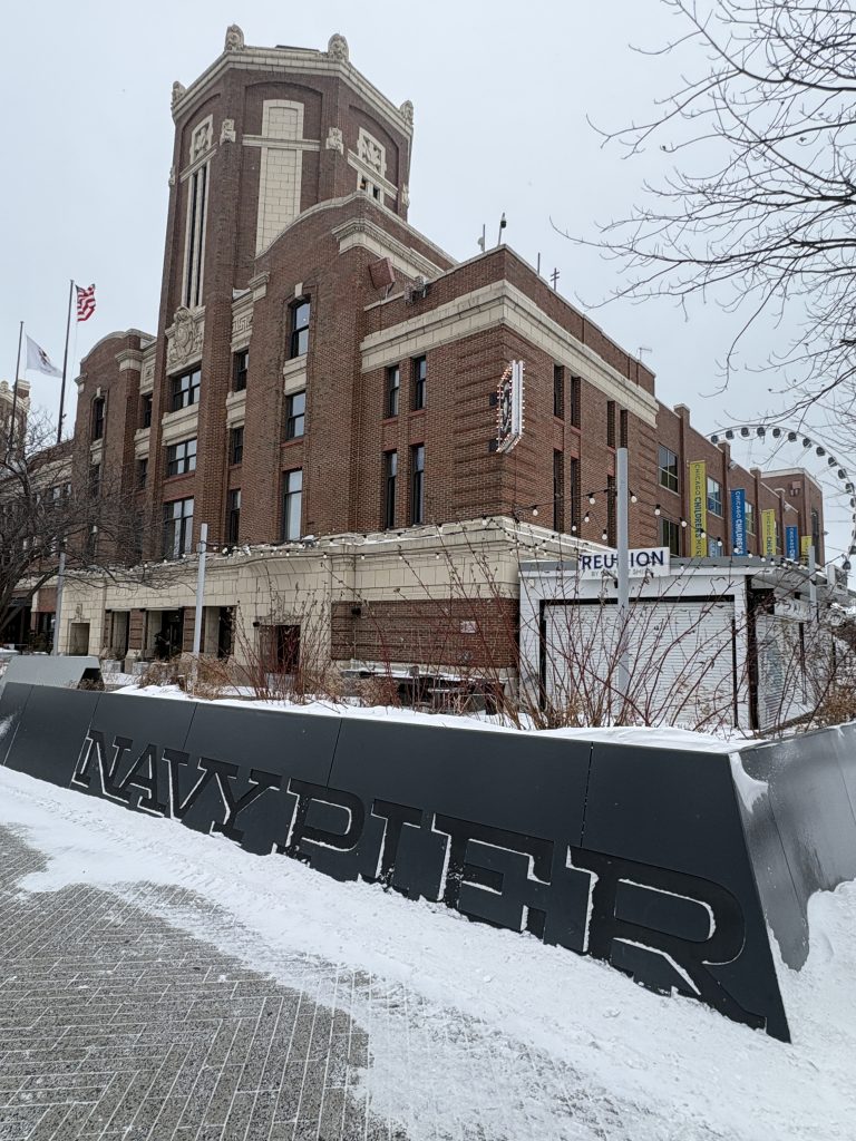Am nächsten Tag waren wir morgens erstmal in einem sehr großen Starbucks. Der heißt Starbucks Reserve und hatte mehrere Etagen. Dort haben wir sehr lecker (und etwas teuer) gefrühstückt. Von dort sind wir zum Navy Pier gelaufen, wo wir einmal drüber spaziert sind. Das ist ja eigentlich eine der Aktivitäten, die man in Chicago auf jeden Fall machen sollte, aber irgendwie war da gar nichts, als wir da waren. Könnte aber auch daran liegen, dass es gerade 10:30 Uhr und unter 0 Grad Celsius kalt war… Das Wasser da in diesem Hafen war auch teilweise zugefroren. Es war also sehr kalt und auf diesem Pier dazu auch noch windig, aber es ist trotzdem gut, mal da gewesen zu sein. Anschließend sind wir zum Chicago Riverwalk gelaufen und da am ebenfalls teils zugefrorenen Fluss entlang spaziert. Das war eigentlich auch ganz cool und schön da. Wir haben auch so Boote in dem Fluss gesehen, wo Whirlpools drin waren. Das fand ich irgendwie lustig, sah aber auch ganz angenehm aus irgendwie. Aber das waren einfach heiße Whirlpools in eiskaltem Wasser! Sowas findet man auch irgendwie nur in Amerika.