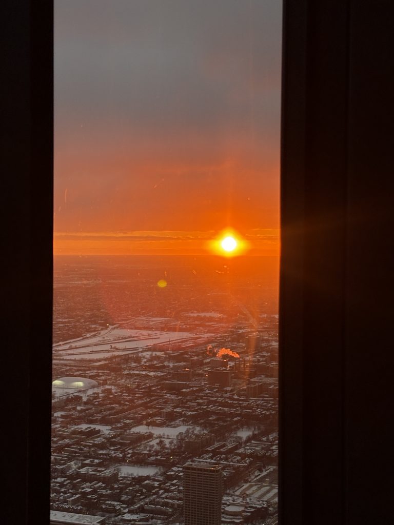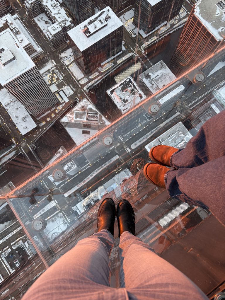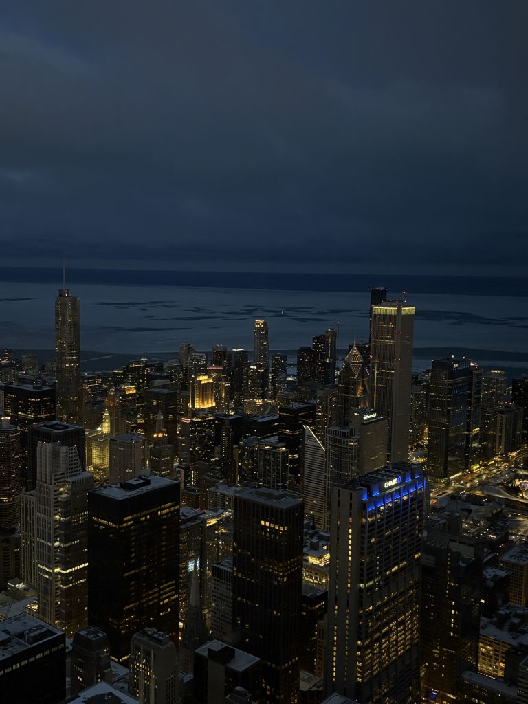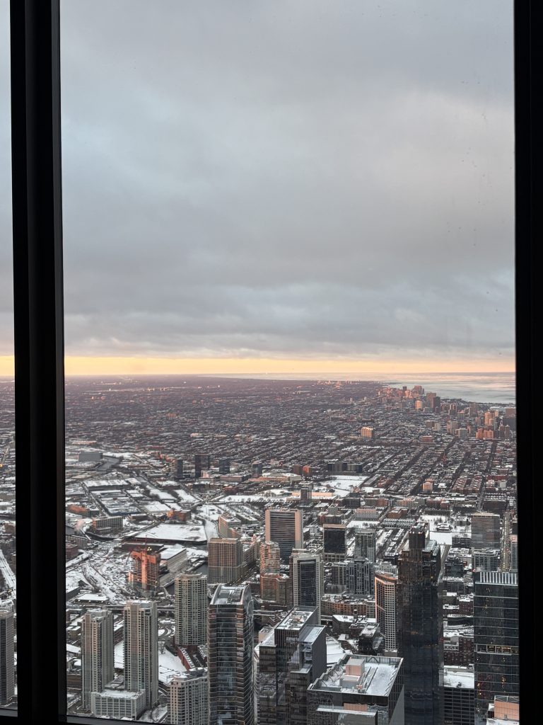 Etwas später haben wir uns dann auch schon auf den Weg zum Skydeck Chicago gemacht, das ist eine Aussichtsplattform. Dort oben haben wir den Sonnenuntergang geguckt, was eigentlich ganz schön war, wobei wir leider jetzt New York gewohnt sind haha von daher war die Aussicht irgendwie nicht ganz so cool, wie wir sie uns vorgestellt hatten, aber es war natürlich trotzdem schön. Ich fand es auch gut, dass man da so weit gucken konnte. In New York sieht man ja eigentlich nur ganz viele Gebäude von den Aussichtsplattformen aus. Aber in Chicago konnte man richtig weit gucken, weil da halt nicht so viele hohe Gebäude stehen. Und ich finde es immer cool zu sehen, wie gerade die Straßen in den USA oft sind. Viele Städte sind ja wirklich wie so Raster aufgebaut, das finde ich irgendwie cool! Zuletzt haben wir noch Deep Dish Pizza gekauft, die ist sehr typisch für Chicago. Das ist Pizza, aber wie ein Kuchen mit Keksboden und Füllung. Also die Pizza hat einen relativ dünnen Teig, der aber am Rand so hochgeht und ist dann mit Tomatensoße und Käse gefüllt quasi. Wir haben diese Pizza aber zum Mitnehmen bestellt und mussten noch zum Hotel laufen. Deshalb war die Pizza schon kalt, als wir sie gegessen haben, aber es war trotzdem ganz lecker. Warm wäre es wahrscheinlich trotzdem besser gewesen hahah