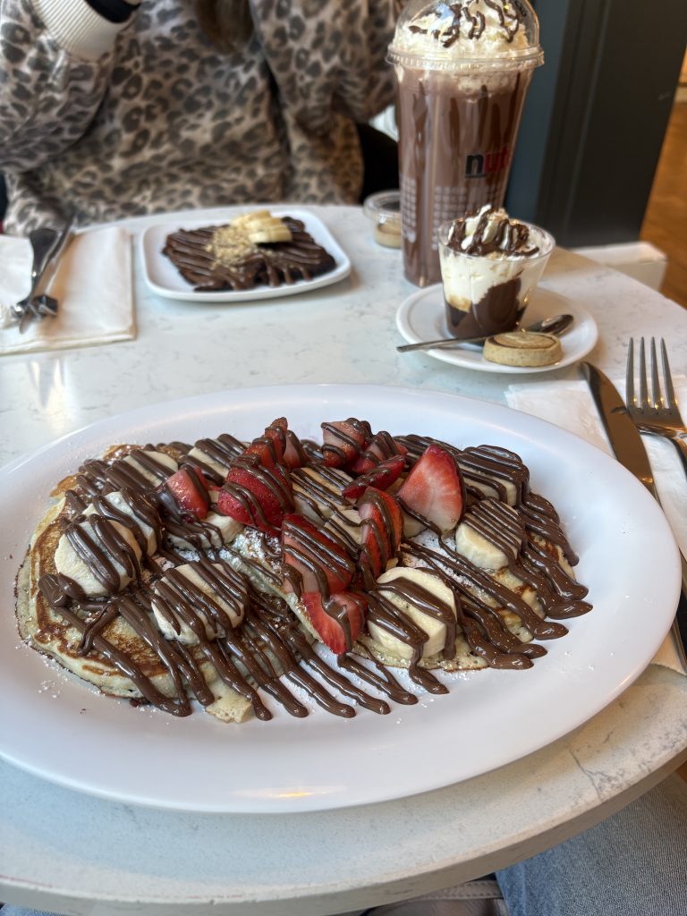 Am nächsten Morgen haben wir unsere Sachen zusammengepackt und aus dem Hotel ausgecheckt. Dann haben wir sehr lecker im Nutella Café gefrühstückt, das war echt cool! Eigentlich wollten wir dann direkt zu einem lululemon Laden, weil ich mir dort eine Tasche kaufen wollte, der hatte aber noch nicht offen. Deshalb mussten wir uns ein bisschen die Zeit vertreiben und waren dann noch eine Weile am Oak Street Beach. Das war auch irgendwie was Neues, ein Strand im Schnee haha aber die Sonne hat geschienen, also war‘s ganz schön. Irgendwann sind wir dann wieder zurück zum Laden gelaufen und ich habe mir auch dort meine Tasche gekauft, worüber ich mich sehr gefreut habe! Den Rest des Vormittags haben wir uns irgendwie die Zeit vertrieben, denn eigentlich hatten wir schon alles gesehen, was wir sehen wollten in Chicago. Wir waren noch in ein paar Läden, haben bei Panda Express etwas gegessen, da gibt es mehr oder weniger chinesisches Fast Food, und wir waren beim Beginn der Route 66, was aber eigentlich nur ein Schild ist. War trotzdem cool haha danach haben wir uns aber auch schon wieder auf den Weg zum Flughafen gemacht und sind zurück nach New York geflogen. Da hat mein Gastvater uns netterweise vom Flughafen abgeholt und nach Hause gefahren.